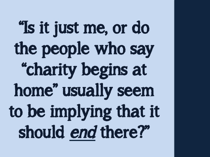 So … this is my question for today, and I’m aware that it is idealistic and unlikely … but whatever debates we have about generosity, global poverty, foreign aid, and caring for the needy at home, can we at least stop pretending that the saying “Charity begins at home” is some kind of magic bullet that trumps all rational discussion?!